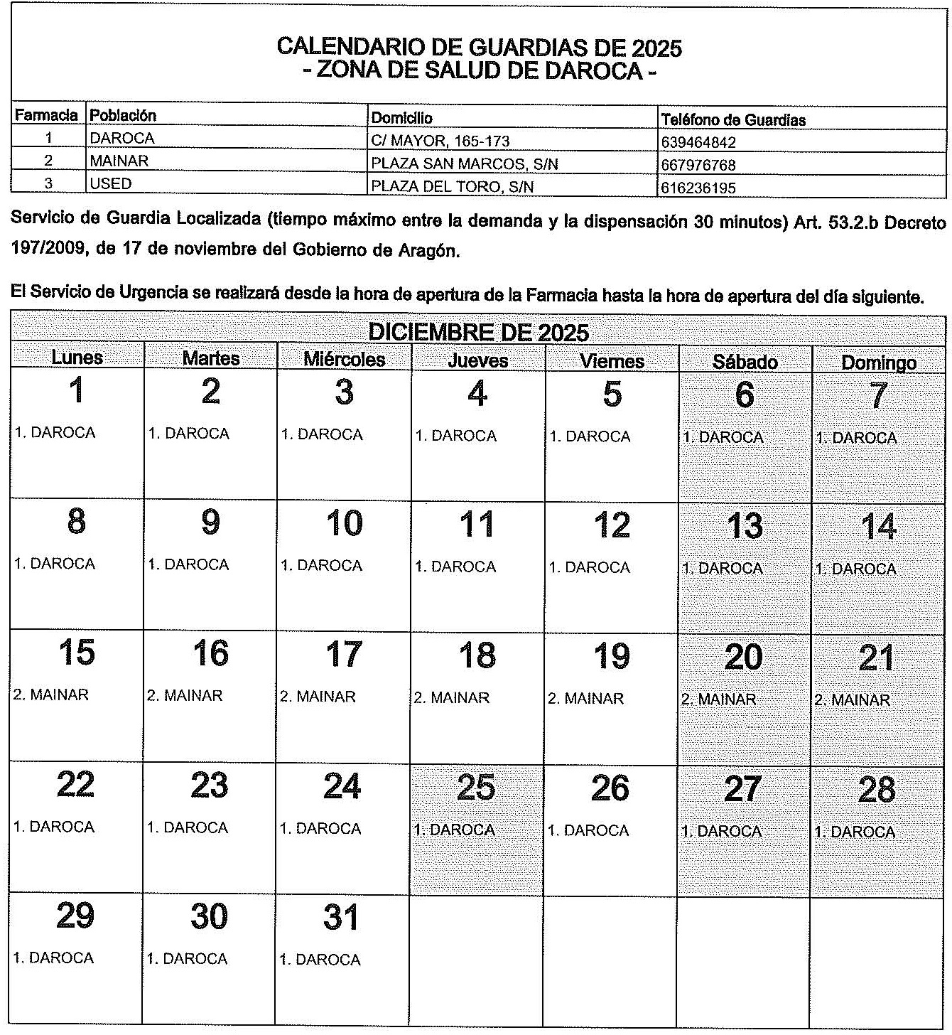 - Horarios Farmacia de Guardia: 976 800 189