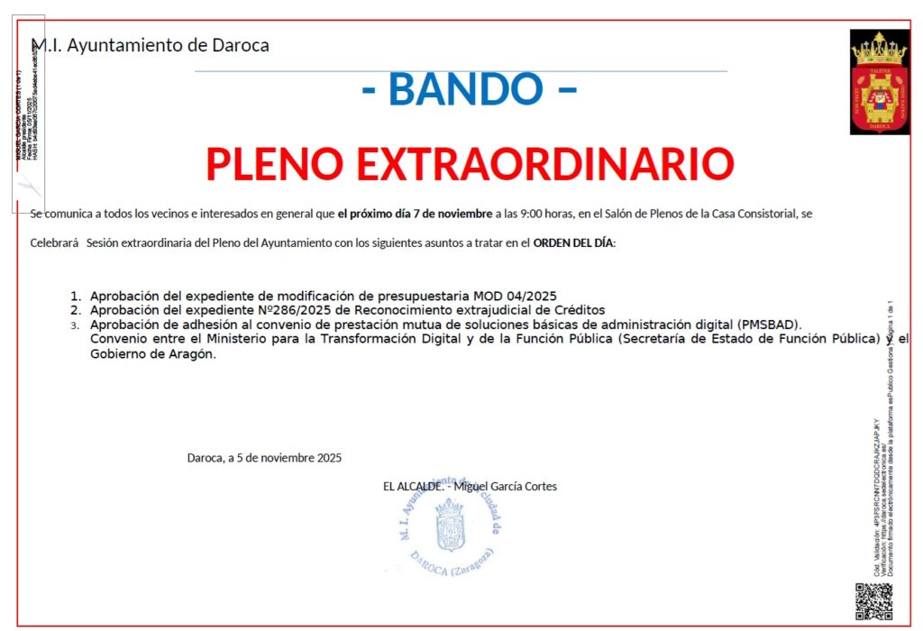 El próximo día 7 de noviembre a las 9:00 horas, en el Salón de Plenos de la Casa Consistorial, se celebrará Sesión extraordinaria del Pleno del Ayuntamiento con los siguientes asuntos a tratar en el ORDEN DEL DÍA:
