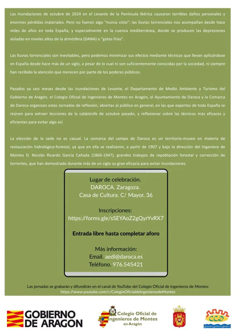 El ayuntamiento de Daroca en colaboración con la Comarca, el Gobierno de Aragón y el Colegio Oficial de Montes de Aragón, organiza estas jornadas tomando como referencia las obras realizadas en el municipio hace más de cien años y que supusieron una mejora respecto a los daños recurrentes con las continuas tormentas y avenidas.